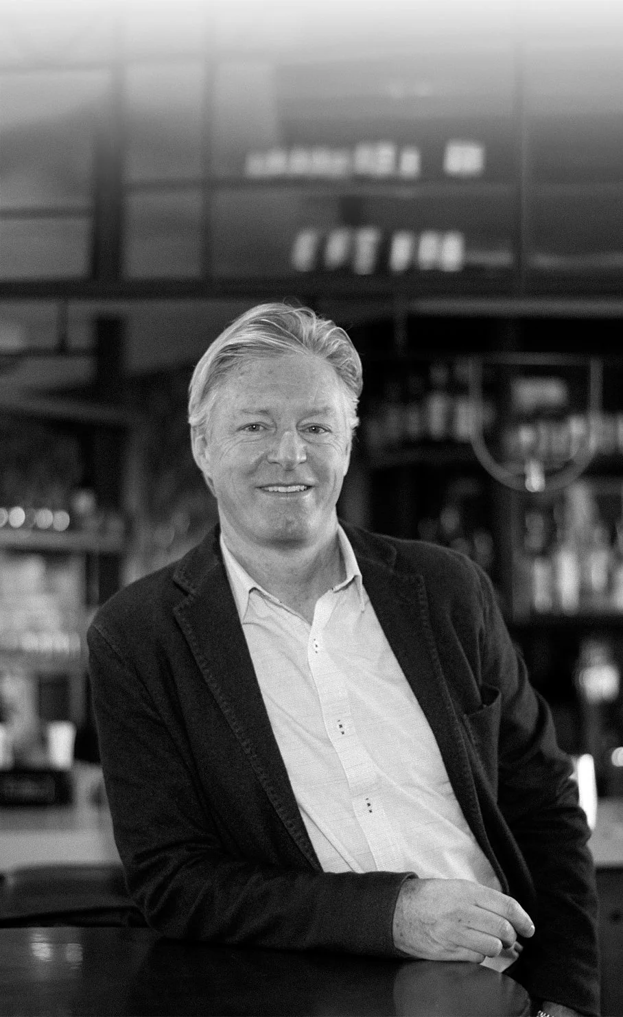 Black and white photo of a man in a suit jacket and shirt, smiling. He is leaning on a table or counter with a blurred background.